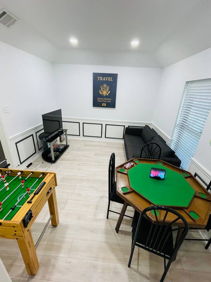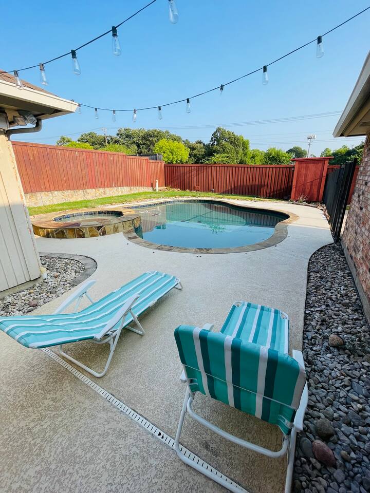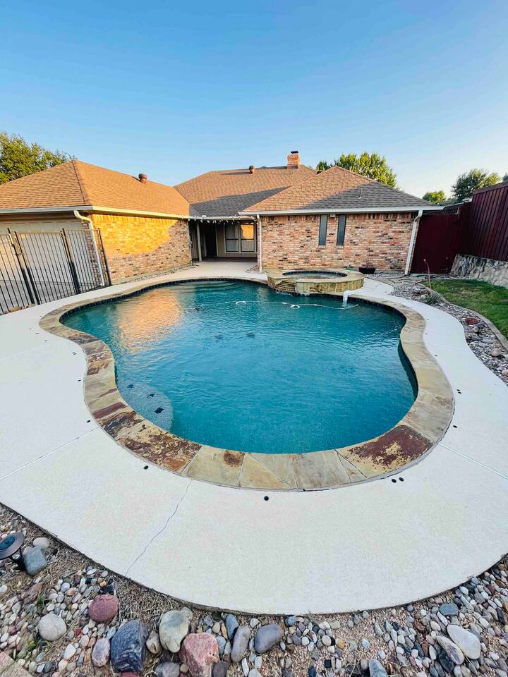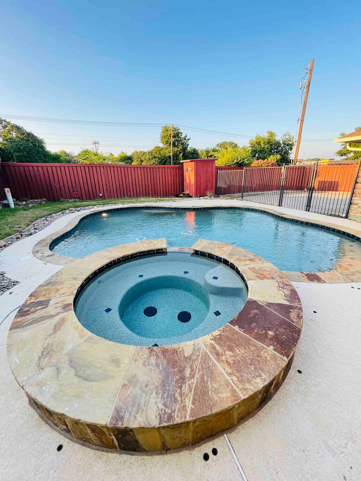 About the Home: Heated Pool and Spa! This modern, new construction, single-family house offers new amenities, appliances and features. Stay in a peaceful and clean abode with the entire place to yourself - the perfect retreat after a day of exploring Dallas or enjoy home! VERY IMPORTANT: There's a $100 PER DAY CHARGE to warm up Pool, no exceptions due to cost to heat up pool. NO EXCEPTIONS - NO CHARGE FOR SPA Home Layout: Single story home! Open layout living room/kitchen, guest full bath, and a private fully fenced backyard. Master room is an en suite with shower and large tub! Every bedroom has its own Smart TV. Unfortunately there's NO access to garage due to thats where we keep our personal items. Sleeping Arrangements: ☆ Primary Bedroom - Comfy, Queen Foam Mattress Mattress (Sleeps 2) ☆ Second Bedroom - Queen Memory Foam Mattress (Sleeps 2) ☆ Third Bedroom - Queen Memory Foam Mattress (Sleeps 2) ☆ Air Mattress (When requested) ☆ 1 Pack-N-Play Crib (When requested) Guest access Car rental or Uber/Lyft is recommended. The home's location provides amazing access to major highways for events and attractions! ► 15 miles to DFW Intl Airport ► 20 min to Cowboy Stadium / Range Stadium ► 20 min to Six Flags ► 20 min to downtown Fort Worth ► 25 miles to downtown Dallas ► 30 min to Love Field Airport There is plenty of parking in driveway in front of house. An additional car can also fit on the long, private driveway, plus free street parking. Other things to note FAQ's ► Is luggage drop-off allowed for early arrivals or late departures? - Yes when available. Luggage can be dropped off one hour before check-in (3:00pm). Please make sure to ask before showing up to ensure its available. ► Early check-in? - Unfortunately, our home is in high demand! Our cleaning team needs adequate time to clean and prepare the house for y'all so Early Check-In varies. Please ask and we will do everything possible to accommodate but fee may apply, otherwise check-in is 3pm ► Late check-out? - Due to high demand, our cleaning team needs the time to clean and prepare the house for the next guests. If you require late check out, it is $50 per hour after 11am, due to cleaning crew needs to bring in extra personal with late check out. Please request in advance, thank you ► Are there coffee shops or restaurants nearby? - Yes! There are several chain restaurants 3-5 min drive but there’s also Texan local places, short 5-8 minute drive. Recommend Old West for breakfast / brunch. ► Can I book on behalf of a friend, family member or co-worker? - While we would love to host whoever you are booking for, we do need them to book for themselves with their own Airbnb account. You can potentially earn travel credit by referring someone to book their first reservation with Airbnb. Go to Account Settings and click on "Invite Friends" for more details.